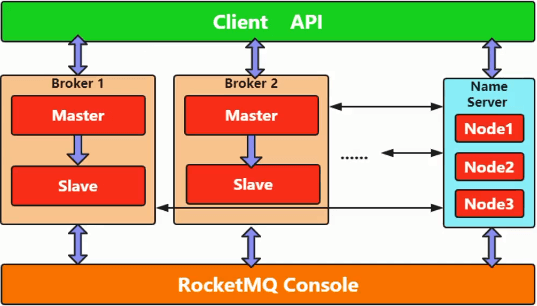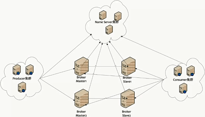 - 每组Broker都是主从部署的,且都会注册自身信息到nameserver