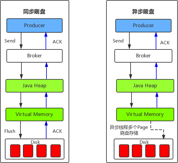 消息到达broker后,就先写到磁盘上,然后才会返回给producer说消息发送成功 - 异步刷盘:性能高,可靠性低